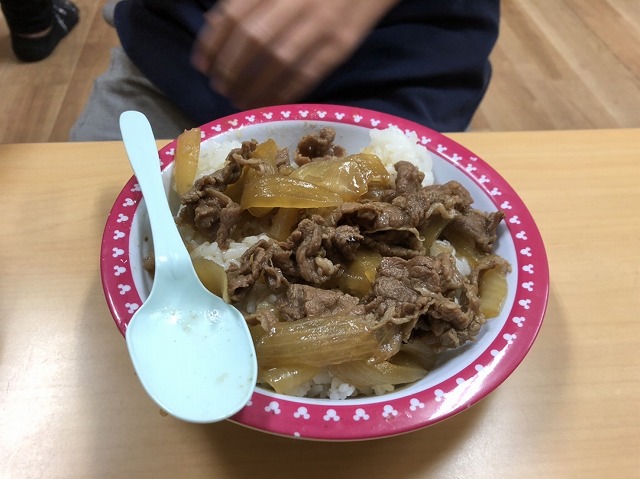 ボリューム満点の牛丼と、優しい味の、お味噌汁。