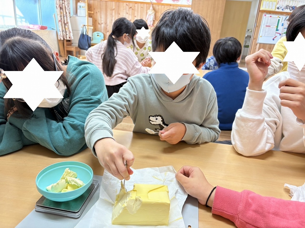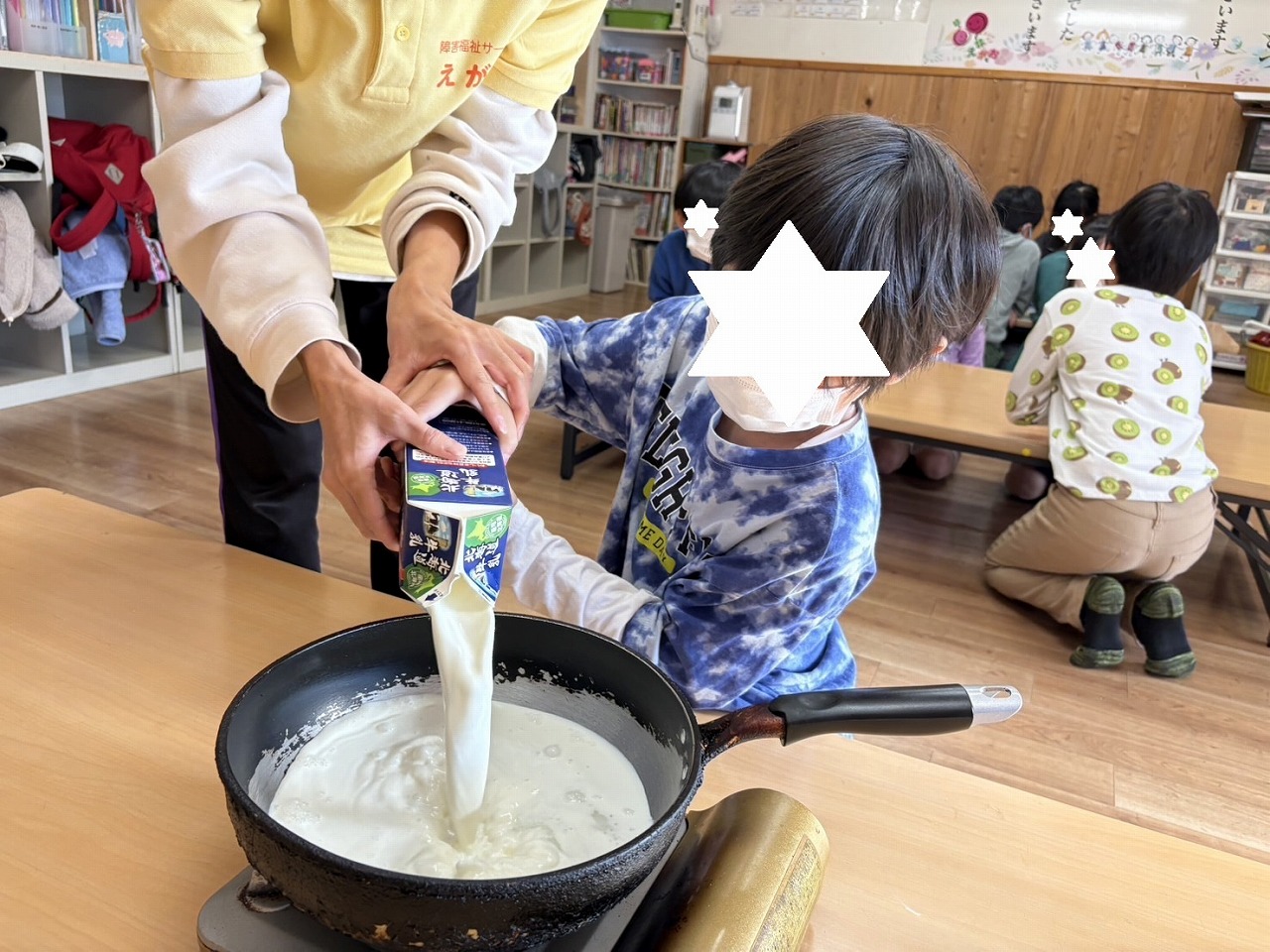 牛乳をフライパンに注いだら、砂糖とバターを加えるよ。