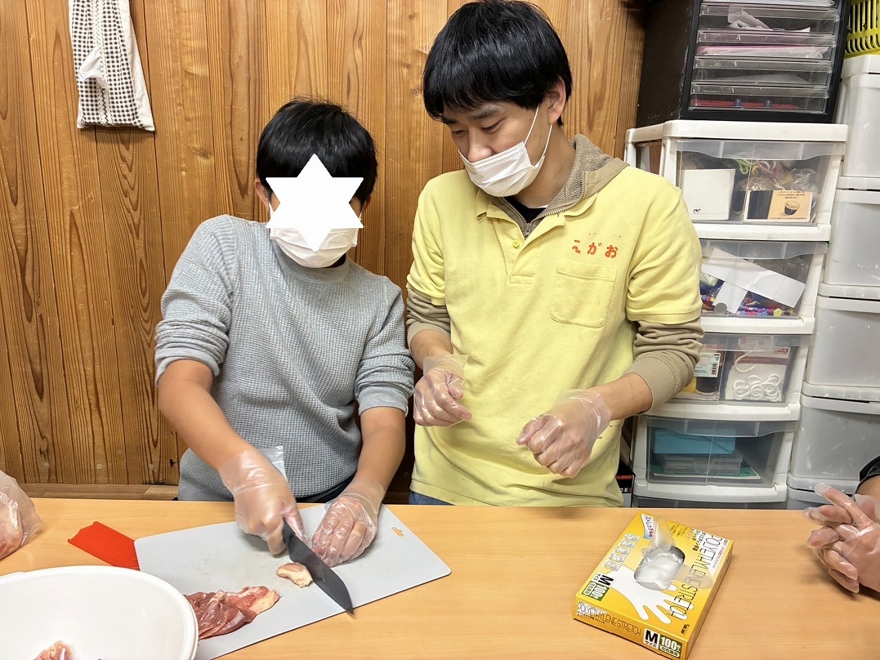 鶏肉を切って、ニンニクやしょうがを揉みこんでいくよ。
